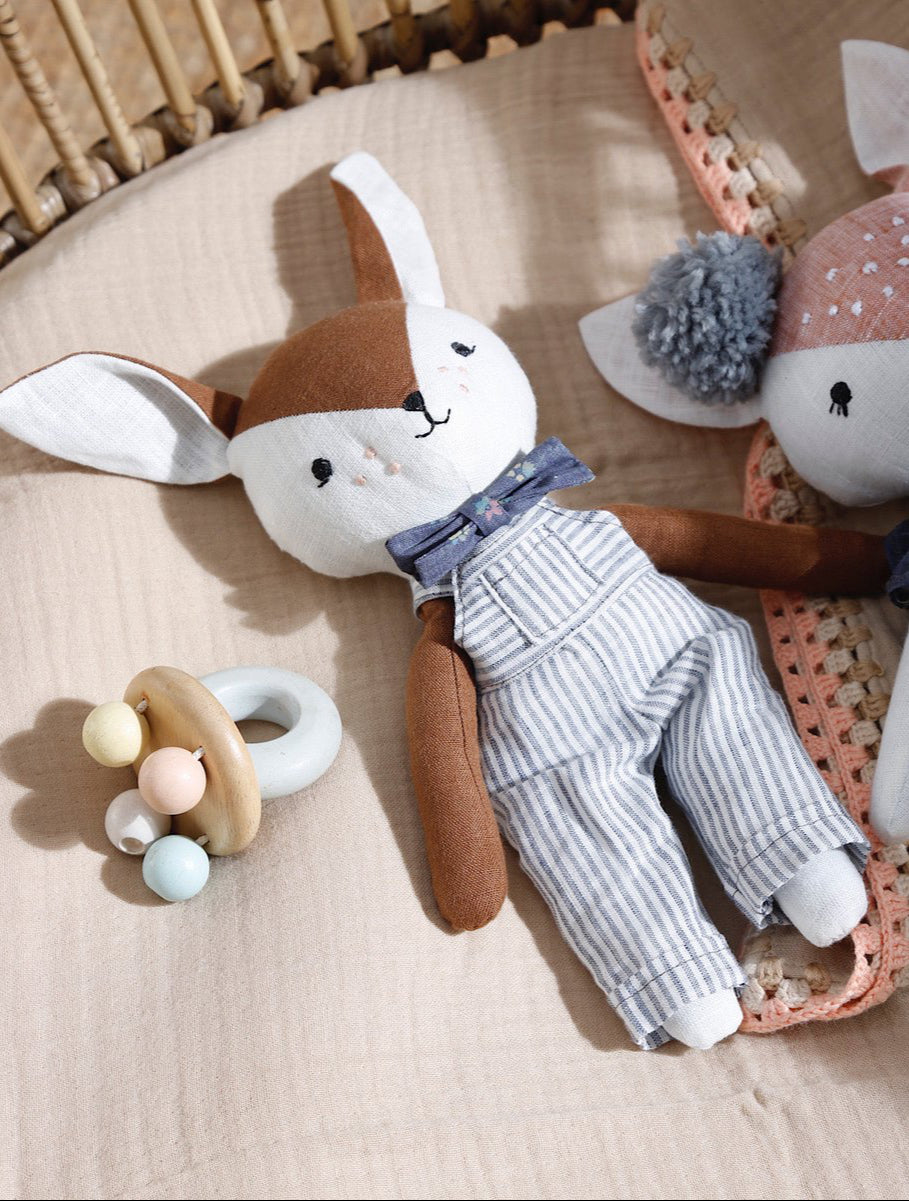 Con le sue lunghe orecchie, il musetto dolce e il look raffinato con salopette a righe e papillon, Bambi è pronto a diventare il nuovo compagno d’avventure (e coccole) del tuo bambino. Realizzato a mano con amore, ogni Bambi è un pezzo unico, pensato per far sorridere i piccoli e rassicurare i grandi.