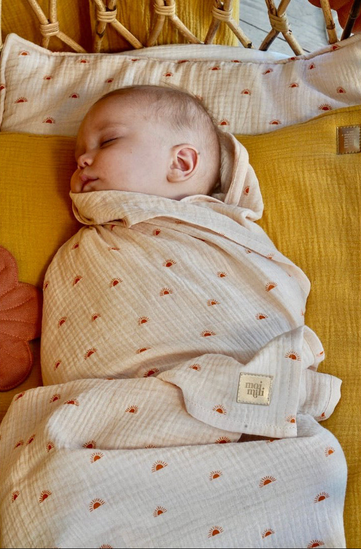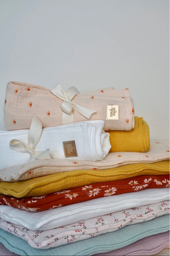 Finalmente Moi Mili ha creato un morbido corredino in mussola pensato per accompagnare il tuo bebè con dolcezza, dalla nanna ai primi momenti di gioco.