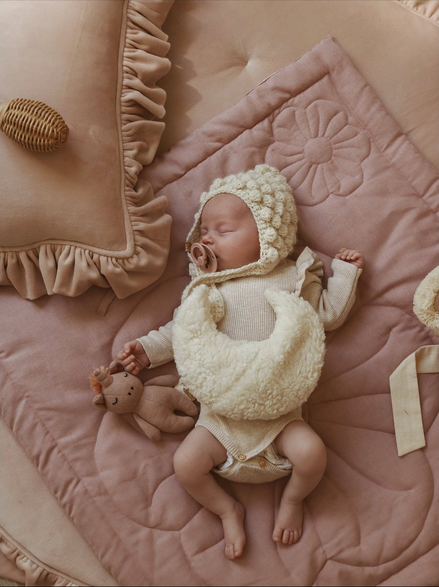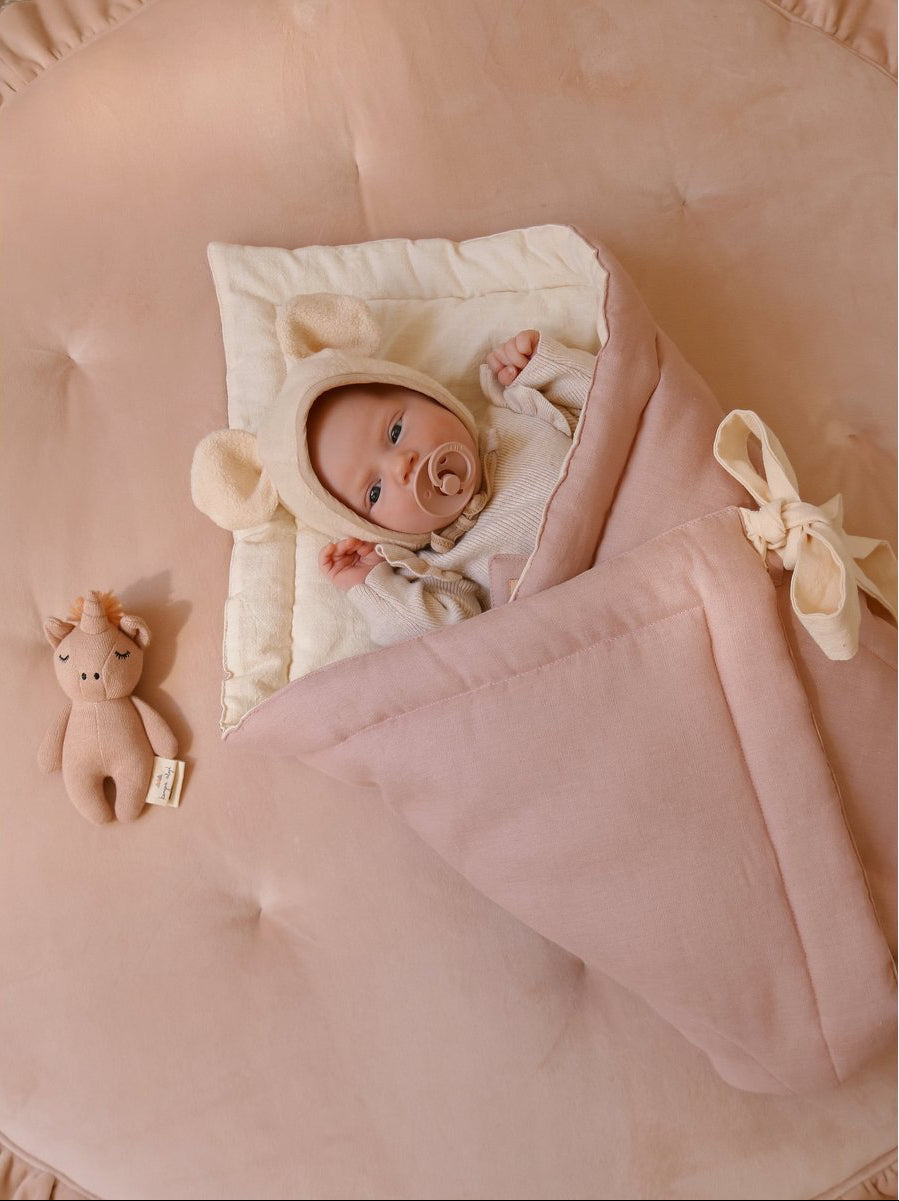 Puoi usarlo per avvolgere il tuo bebè, cambiarlo o come soffice tappetino da gioco. Ogni dettaglio è pensato per un comfort totale: il Sacco Nanna è trapuntato, con un’imbottitura anallergica in materiale siliconico spesso, e rifinito con una dolce chiusura a fiocco.