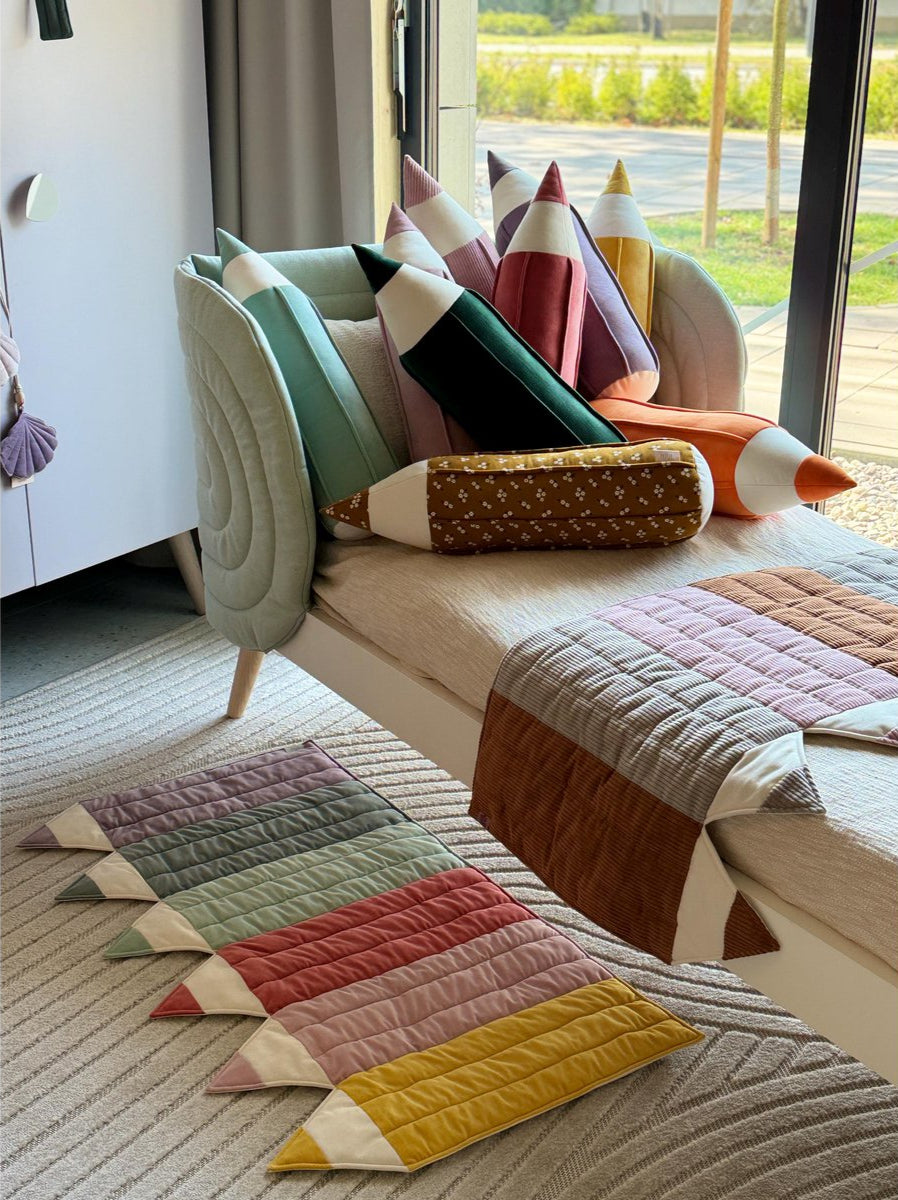 Il Tappetino Pastelli della Collezione “Back to School” di Moi Mili è molto più di un semplice tappeto: è uno spazio morbido dove il tuo bambino può giocare, imparare e sognare in totale sicurezza. Realizzato a mano con velluto e velluto a coste in cotone 100% certificato GOTS, combina sostenibilità, eleganza e un tocco di allegria.