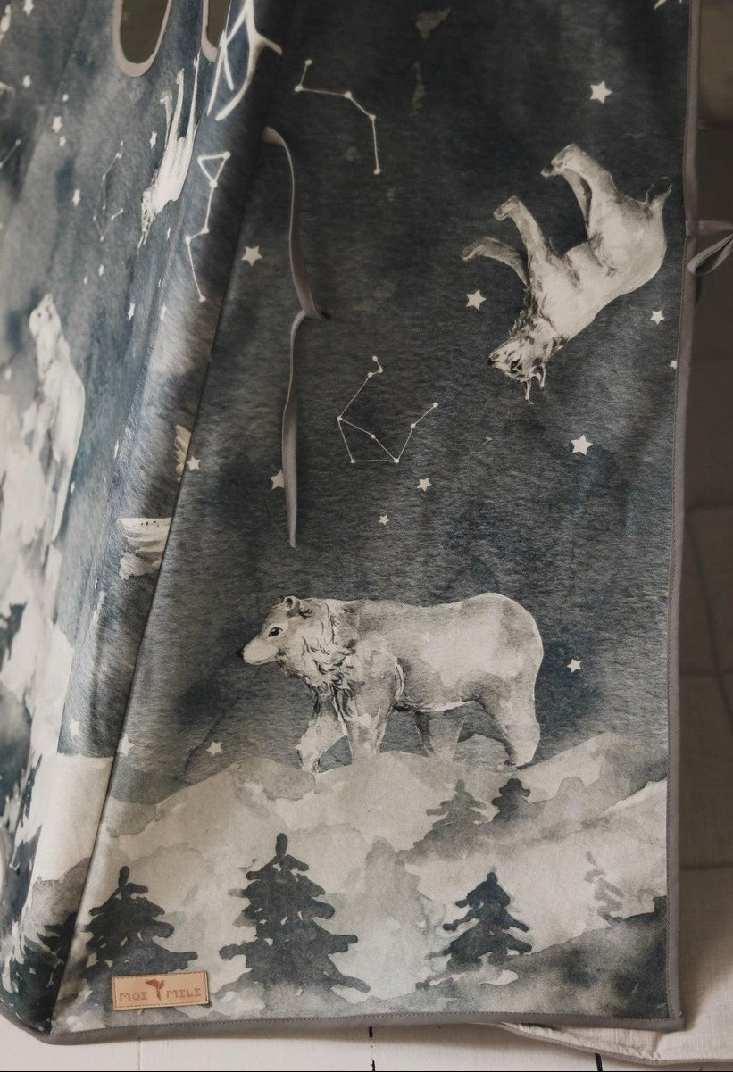 Parte della collezione Night Sky creata in collaborazione con l’illustratrice Kasia Goraj-Stróżyńska. Una collezione poetica, dove animali e costellazioni prendono vita come piccole luci che brillano in un limpido cielo montano d’inverno. Ogni dettaglio della tenda porta con sé un pizzico di magia, trasformando la cameretta in un cielo stellato pieno di avventure da immaginare.
